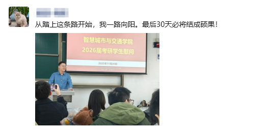 在考研冲刺的号角声中,时间悄然走到了考研倒计时30天的关键节点。为帮助考研同学坚定考研信心、缓解备考压力,学院党委副书记夏夏,班级学术导师代表文扬东、梅洁,毕业生辅导员刘翔、魏岚和全体辅导员老师一起为同学们送上美好祝福和温馨关怀。
