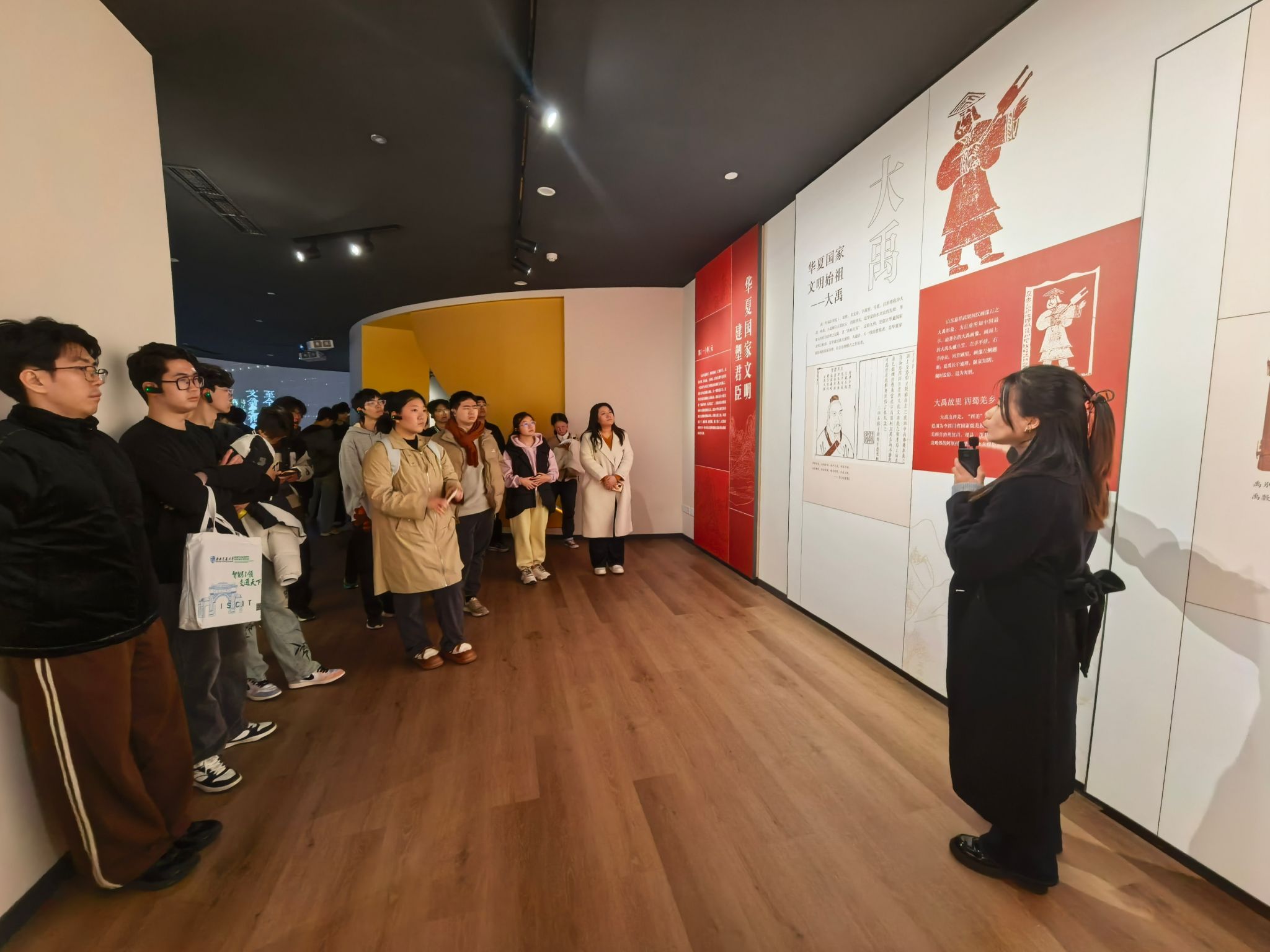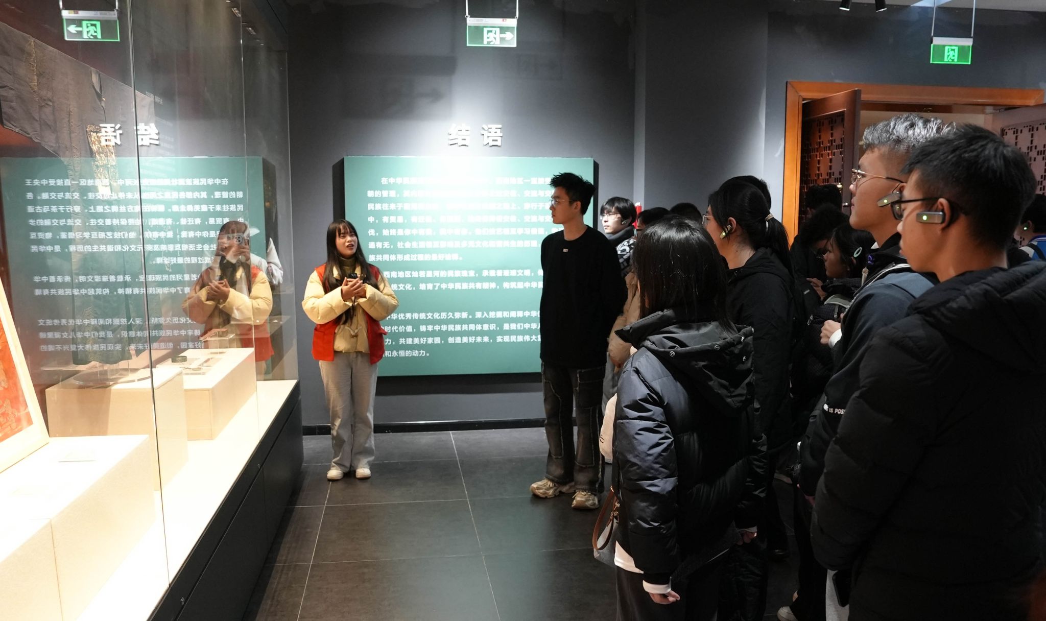走进西南民大博物馆,民族文物依次铺展,宛如一幅各民族文化交融共生的画卷。在讲解员的细致引导下,同学们观察生活器具的工艺细节,了解各民族在生产生活中相互借鉴、彼此成就的历史历程,深刻体会“中华民族共同体”的丰富内涵。
