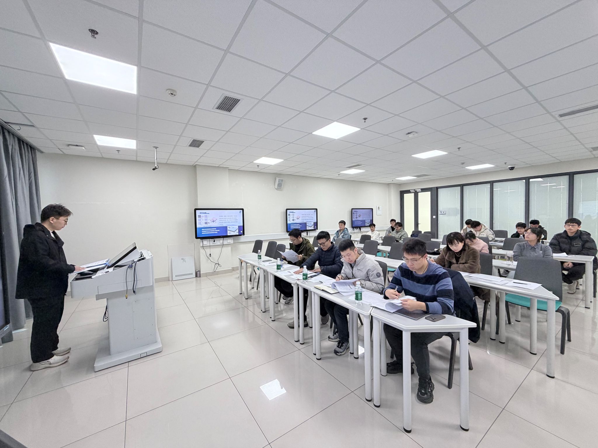 被抽查的16名同学依次上台,从研究背景、工作内容、技术路线、工作计划和已完成的工作情况等方面进行了详细阐述。评委老师们认真听取了每位同学的汇报,针对选题的科学性、研究方案的合理性、研究方法的适用性等关键问题进行了细致提问,并结合自身专业经验给出了极具建设性的指导意见。