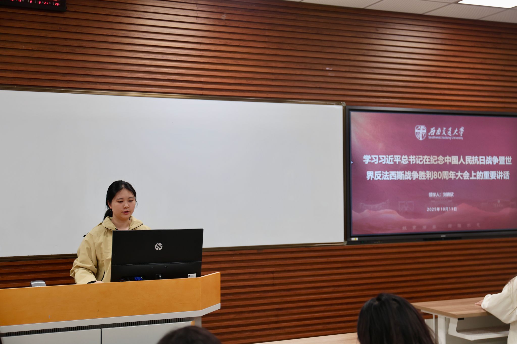 为筑牢学生会成员理想信念根基,切实提升组织战斗力与服务效能,智慧城市与交通学院学生会于2025年10月12日下午在X1201开展主题为“学习习近平总书记在纪念中国人民抗日战争暨世界反法西斯战争胜利80周年大会上的重要讲话”的政治学习暨全员大会。本次学习由智慧城市与交通学生会主席团候选人刘锦欣领学,指导老师魏岚与学生会全体成员参加。