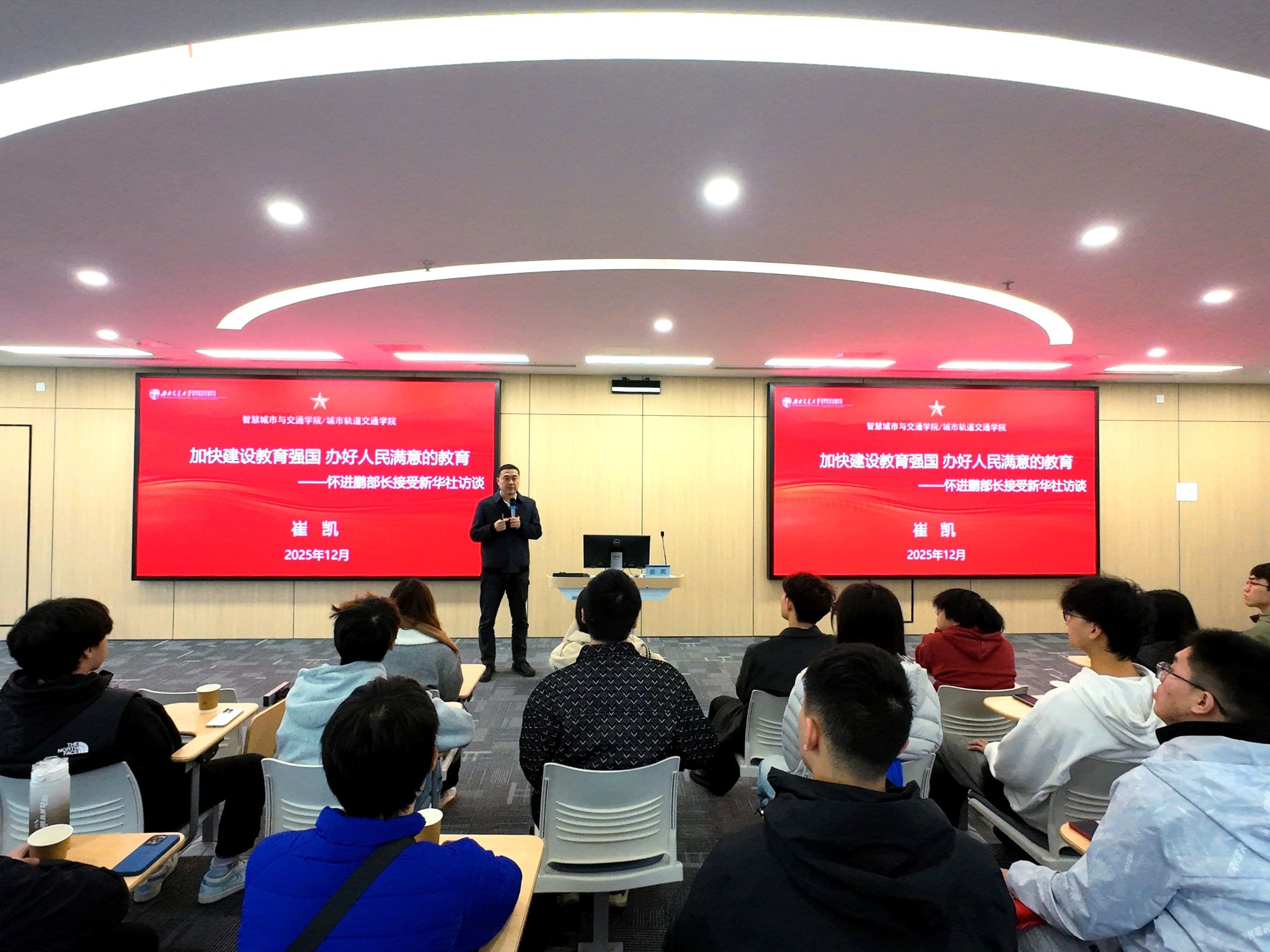 为深入学习贯彻党的二十届四中全会精神,学习领会习近平总书记关于教育的重要论述,进一步统一思想、凝聚共识,12月4日下午,校长助理、智慧城市与交通学院院长崔凯讲授专题党课和思政课。学院党委书记李涛和学生党员参加。课前,党员同志们积极担任“校区观察员”,走进学生宿...